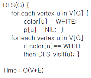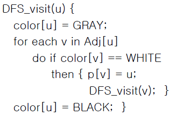 (color[] 배열은 현재 위치의 방문 여부를 판별하기 위한 배열로 없어도 되지만, 이 배열로 그래프가 cycle을 이루는지에 대한 여부를 판결할 수 있습니다. 속성으로는 WHITE(방문 안함), GRAY(현재 방문 중), BLACK(이미 방문함))